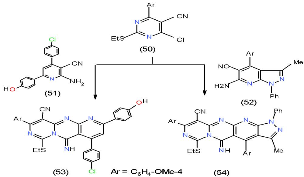 Pyridopyrimidine derivatives are a privileged bicyclic ring system. Due to its potent and significant biological activities it has great pharmaceutical importance; synthesis of these compounds is considerable interest. The development of a practical method for the synthesis of various pyrido- pyrimidines, in view of their structure relation with peteridine, is of interest in the field of medicinal chemistry [19]. Most preparation of pyridopyrimidines concentrated on ring closure reactions of either pyridine or pyrimidine nucleus having appropriate substituents. Accordingly, chloropyridinecarbonitrile 50 reacted with some heterocycles having vicinal amino-cyano groups such as 2-aminopyridinecarbonitrile 51 and 3-aminopyrazolopyridinecarbonitrile 52 to afford the respective polycyclic systems 53 and 54 having pyridolopyrimidines in their structures [20](Scheme11).