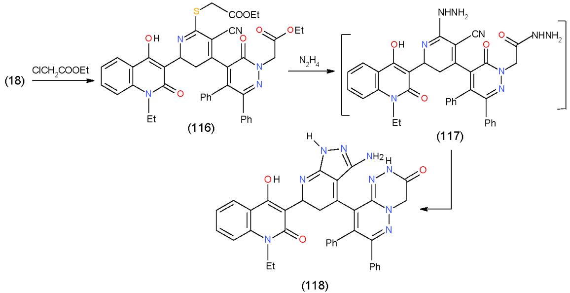 Treatment of 116 with hydrazine hydrate produced pyridazino1,2,4-triazinone 118 through the non-separable intermediate 117 [9]. (Scheme 24).