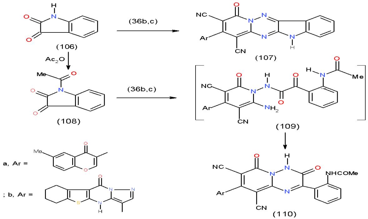 Whereas, a different behavior was observed on treating 36b, c with N-acetylisatin 108 in glacial acetic acid as it furnished pyridotriazinone 110a, b. The formation of 110 took place via the intermediate 109 \[14\](Scheme 22).
