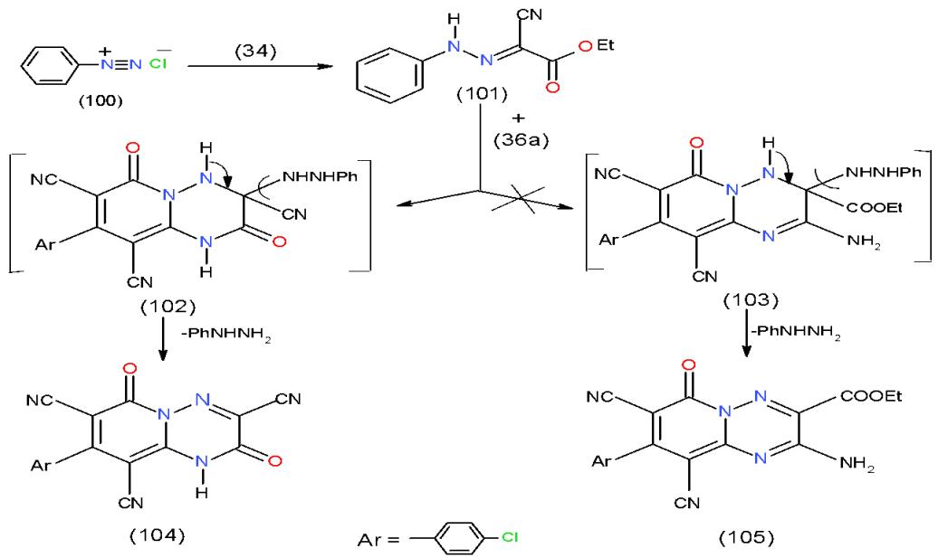 Moreover, the action of ethyl $\alpha$ -cyano- $\alpha$ -phenylazoacetate 101, obtained via the condensation of ethyl cyanoacetate (34) with benzenediazonium chloride 100 upon diaminopyridinedicarbo- dicabonitrile 36a afforded pyrido 1,2,4-triazinone 104 instead of aminopyrido 1,2,4-triazine 105. The formation of 104 could be explained via non-separable intermediate 102 not 103 \[11\](Scheme 21).