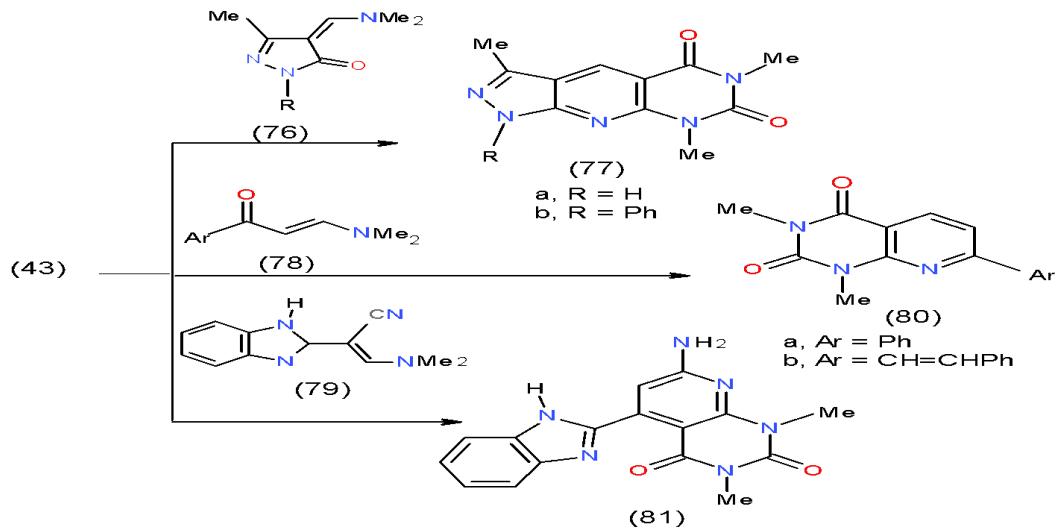 pyrimidinediones 80a, b and benzimidazolylpyridopyrimidinedione 81 obtained from the reaction of compound 43 with two enaminones 78a, b and enamine 79, respectively \[25\](Scheme 15).