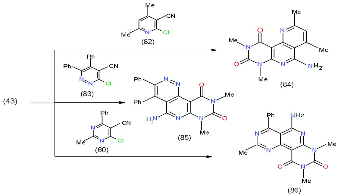 Moreover, 6-amino-1,3-dimethyluracil (43) having an active methine group at position-5, reacted with some bifunctional heterocyclic systems having vicinal chloro-cyano groups in their structures such as 2-chloropyridinecarbonitrile 82, 3-chloropyridazinecarbonitrile 83 and 4-chloropyrimidinecarbonitrile 60 and afforded the novel triheterocyclic systems having pyridopyrimidines in their structures 84-86, respectively \[25\](Scheme 16).