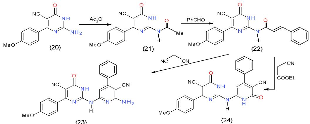 Moreover, acylation of 2-aminopyrimidinecarbonitrile (20) using acetic anhydride yielded 2-acetamidopyrimidinecarbonitrile (21), which underwent condensation with benzaldehyde in ethanolic sodium hydroxide giving 2-(N-cinnamoylamino) pyrimidine-carbonitrile (22). As reported for $\alpha$, $\beta$ -unsaturated ketones, the interaction of compound 22 with active methylene compounds afforded the substituted pyridine. Accordingly, when compound 22 was allowed to react with malononitrile (7) and ethyl cyanoacetate in the presence of ammonium acetate afforded 2-amino-6-pyrimidinylaminopyridinecarbonitrile (23) and 3-cyano-6-pyrimidinylamino-pyridone (24), respectively \[11\](Scheme 5).