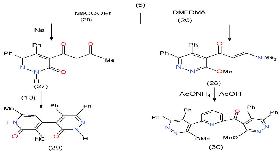 In addition to the use of acetylyridazine (5) in the formation of some enones, it could be converted into a new active methylene compound or enaminone and used them in the synthesis of pyridine. Accordingly, synthesized active methylene compound namely, pyridazinyl-butan-1,3-dione 27 obtained from the reaction of 4-acetylpyridazinone 5 with ethyl acetate (25) under clasein condensation [12]. Whereas, the enaminons 28 formed through condensation of 5 with dimethyl-formamide dimethylacetal, DMFDA, (26) in non-polar solvent [9]. Cyclocondensation of cyano