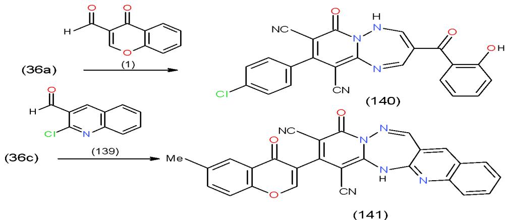 Scheme 27: Formation of substituted and condensed pyridotriazepines On the other hand, the action of 3-formylchromone (1) upon 36a and the effect of 2-chloro-3-formylquinoline (139) on 36c was studied and