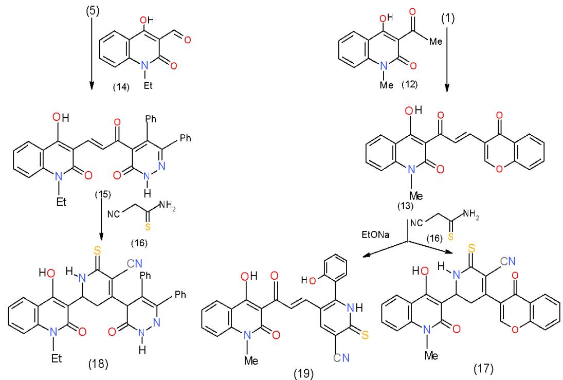 Similarly, another two synthesized enones having quinolone in their structures was prepared, the enone 13 obtained by condensation of formylchromone cyanothioacetamide (16) and the enones 13 and 15 was carried out in ethanol containing piperidinium acetate, the respective 4,6-diheterocyclylpyridines 17 and 18, was obtained. But when the reaction between 13 and 16