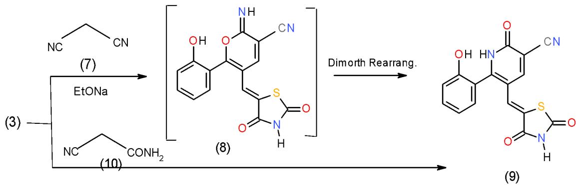 The action of malonitrile (7) upon the two enones 3 and 6 showed two different behaviors. The presence of chromone with an active methine at C2 in the enone 3 facilitate the attack by the carbanion at C2 causing ring-opening of the $\gamma$ -pyron ring followed by ting closure producing the target pyridine. Thus, the reaction of chromenylthiazolidine derivative 3 with malonitrile (7) in basic medium afforded the intermediate 8, which underwent Dimorth rearrangement under the reaction condition to yield oxopyridinecarbonitrile 9. Compound 9 also obtained directly by the action of cyanoacetamide (10) upon biheterocyclicinenone 3 \[7\](Scheme 2).