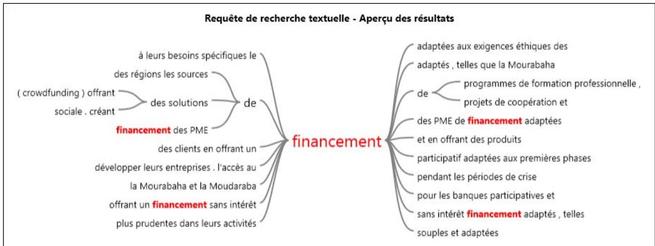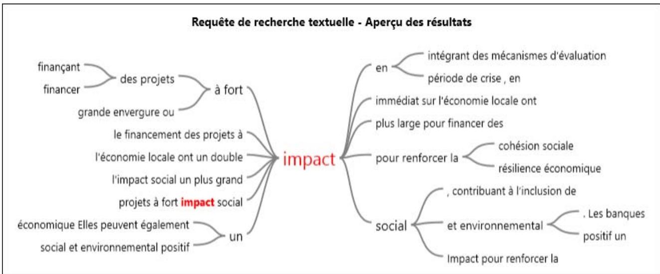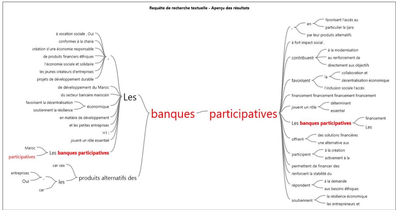 Nous remarquons d'après le tableau et le nuage de mots que les Treize mots les plus fréquemment utilisés sont Impact, banques participatives, contribuent, développement, rôle, déterminant, promotion, renforcer, financement, produits alternatifs. Afin de détailler notre recherche sur ces Treize mots, nous avons eu recours à la requête de recherche textuelle réalisé par le logiciel Nvivo. Les résultats de la recherche textuelle sont présentés dans les figures suivantes:
