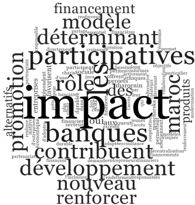 Le mot impact arrive en première position avec un pourcentage pondéré de $7.92\%$, illustrant l'apport de la banque participative dans le nouveau modèle de développement du Maroc. Ces banques jouent un rôle important dans le financement de projets ayant des impacts sociaux, économiques et environnementaux importants. Leur implication dans la mise en œuvre de projets d'envergure ou locaux a un double effet: soutenir l'économie locale et renforcer la cohésion sociale. En intégrant des mécanismes d'évaluation et de relance, ils