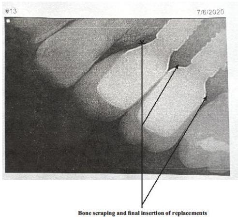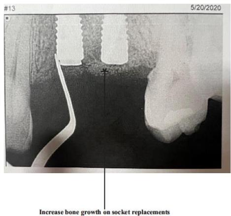 The observations compiled by licensed physicians and specialists in the medical field were entered and compared. It was observed that using Innovation provokes a significant response, i.e., is a reduction in a variety of symptoms for patients with Serious or Life-threatening conditions or diseases that required monitoring for doses and reactions by both the attending licensed physician, registered nurse, or another specialist in the medical field [16]. The X-ray taken in (Figure 4) and (Figure 5) are of a 58-year-old male that required two teeth to be replaced. The subject had been taking Innovation products prior to the removal and replacement of the subject teeth. In (Figure 4) you will notice the replacement sockets inserted for the teeth without bone overgrowth. After six months when the replacement teeth were to be inserted, you will notice in (Figure 5) that there has been an overgrowth of bone which had to be removed before