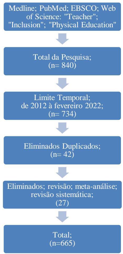 Foram analisados os estudos publicados originalmente em língua inglesa, entre 2012 à fevereiro de 2022, tendo como referência a base de dados eletrônicas Pub-Med, Medline, Web of Science, EBSCO, utilizando as seguintes palavras chaves: "teacher", "inclusion" e "physical education", eliminados artigos de revisão, meta-análise e revisão sistemática e incluídos apenas artigos empíricos com a metodologia utilizada claramente escrita, sendo considerados apenas os artigos que analisaram a percepção dos professores de educação física sobre a inclusão de alunos com necessidades especiais, os artigos foram selecionados em uma tabela para melhor compreensão da temática abordada no presente estudo.
