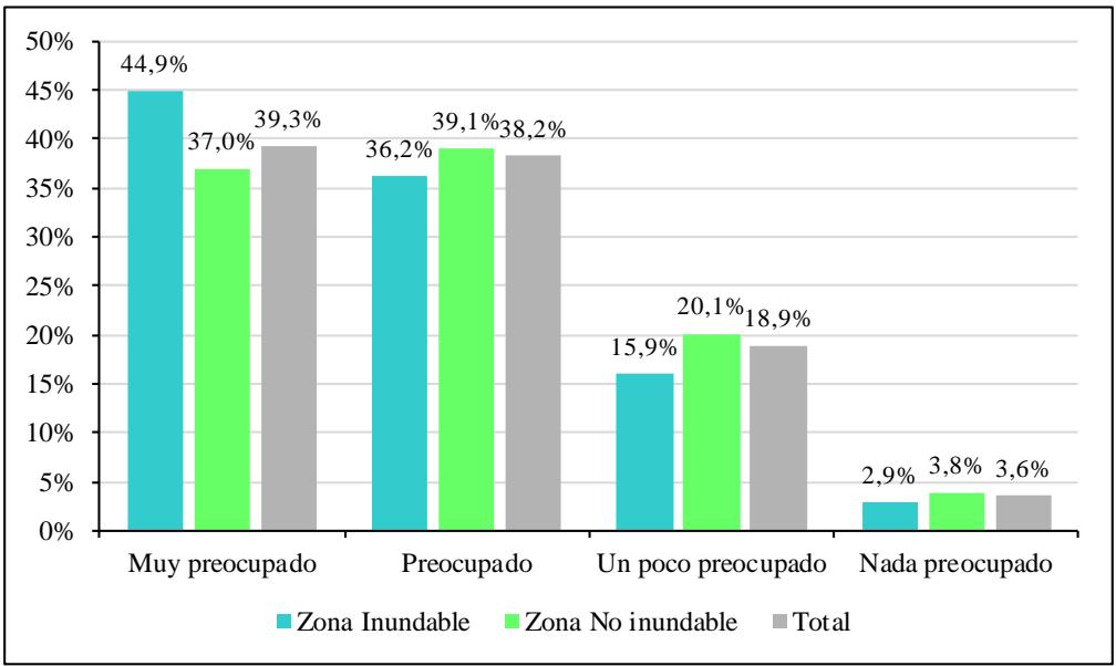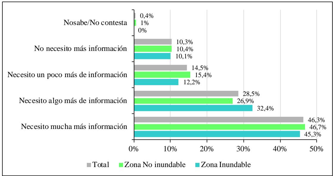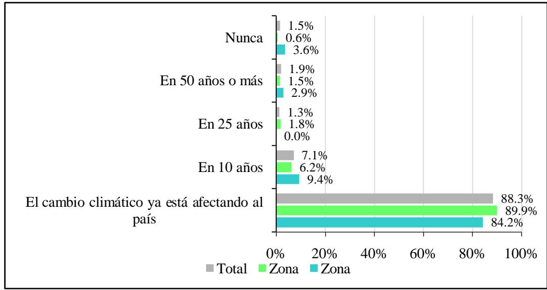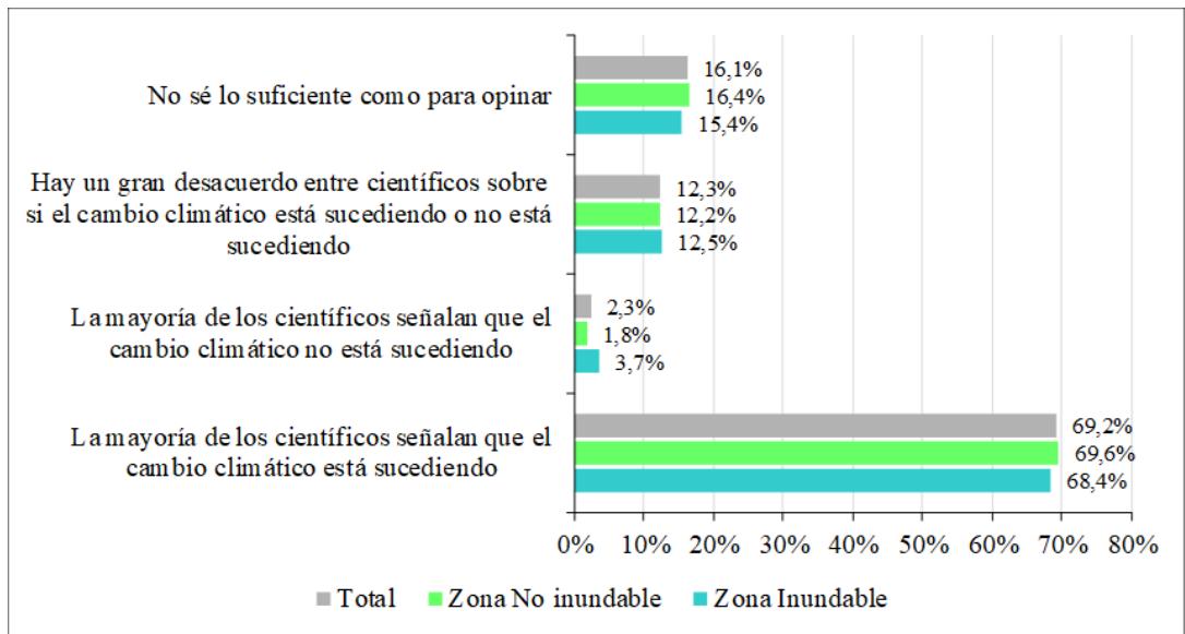 Se hallaron diferencias marcadas entre zonas, cinco de cada diez encuestados en la zona inundable manifestó haber escuchado sobre el cambio climático (el $53,1\% )$, sin embargo, en mayor proporción en la zona no inundable, donde ocho de cada diez encuestados señaló haber escuchado sobre el tema $( 83,5\% )$.