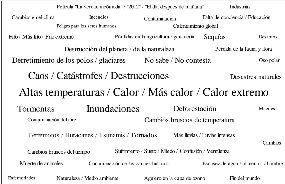 A pesar de que las imágenes asociativas evocaron un efecto negativo, principalmente en los impactos del cambio climático $( 55,5\% )$, sin embargo, un bajo porcentaje relacionó con los impactos en la salud $( 1,3\% )$, muy pocas personas asociaron el cambio climático con sus causas $( 15\% )$ y no hubo vinculaciones con las soluciones. El primer paso para afrontar el reto del cambio climático es entenderlo. Probablemente, diseñar estrategias de comunicación, que reflejen las causas del cambio climático, así como el consenso de los expertos y adopción de hábitos con información acerca de su efectividad, vinculando con el ahorro de dinero y la protección ambiental, podrían alentar a la población a participar en reducir sus emisiones de carbono para contribuir a la lucha contra el cambio climático.