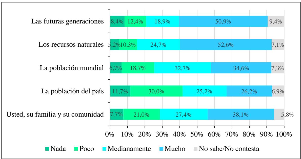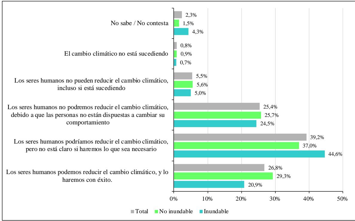 A pesar de la aceptación de la problemática de cambio climático, un cuarto de la población encuestada $( 25,4\% )$ expresaron su pesimismo al respecto indicando que los seres humanos no podremos reducir el cambio climático, debido a que las personas no están dispuestas a cambiar su comportamiento. El $5,5\%$ manifestó que los seres humanos no pueden reducir el cambio climático, incluso si está sucediendo.
