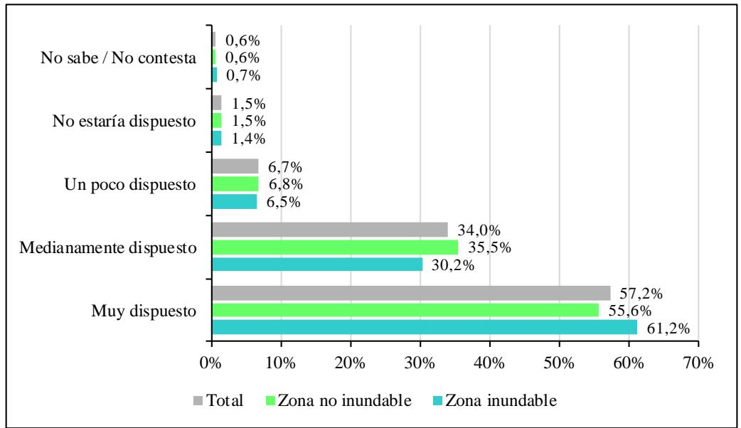 Por otro lado, considerando las subpoblaciones, el $61\%$ de la zona inundable están muy dispuestos y en menor porcentaje la zona no inundable $( 55,6\% )$. Es probable que los que experimentaron inundaciones manifestaron estar más preocupados por el cambio climático, sino que también perciben que cambiado sus comportamientos pueden ayudar a reducir los efectos del cambio climático).