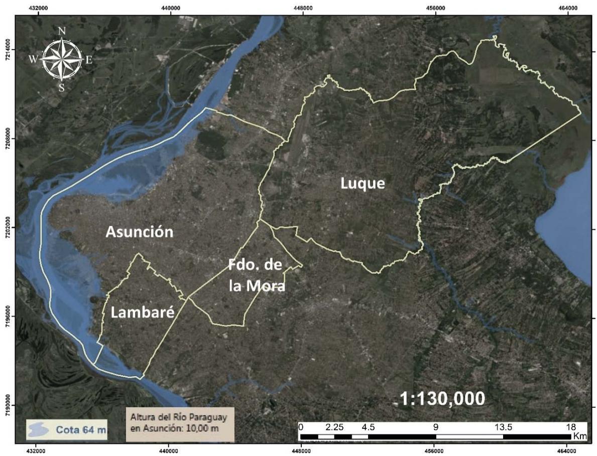 En la Figura 2, se observa la zona inundable en Asunción, y se define como aquellas áreas ribereñas donde ocurren las inundaciones fluviales, que son "fenómenos naturales debido a la crecida natural de un río que condicionan la formación de planicies aluviales, cercano a los cursos de agua periódicamente inundables" (2) pudiendo alcanzar hasta una altura de 10m (cota 64) del río Paraguay en la ciudad de Asunción.