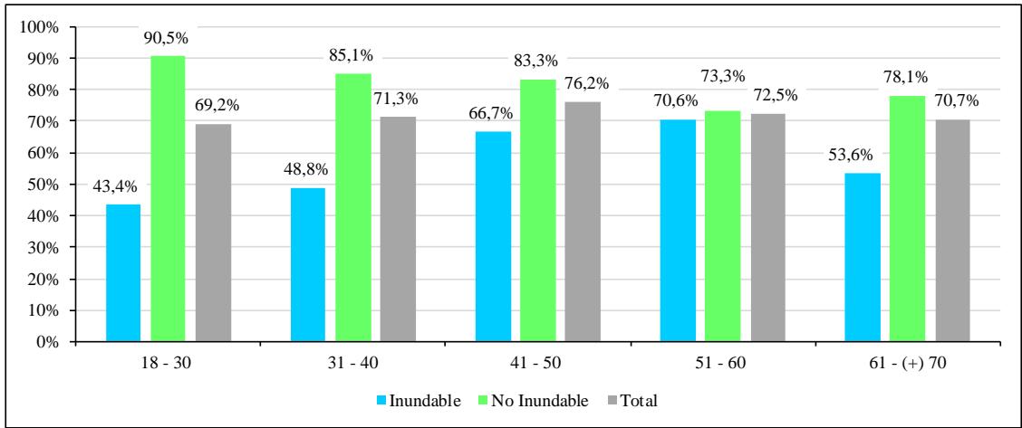 Se distinguen marcadas diferencias cuando se consideran las subpoblaciones por zona y edad, siendo aún más notorio en los dos primeros intervalos de edad. El $43,4\%$ de la población más joven (18 30 años) de la zona inundable, manifestó haber escuchado al respecto, mientras que un porcentaje mayor se observó en la zona no inundable, con el $90,5\%$. De la misma manera se observan acentuadas diferencias en la población de 31 a 40 años, en la zona inundable, solo el $48,8\%$ señaló haber escuchado sobre el tema y en mayor proporción en la zona no inundable, con el $85,1\%$.