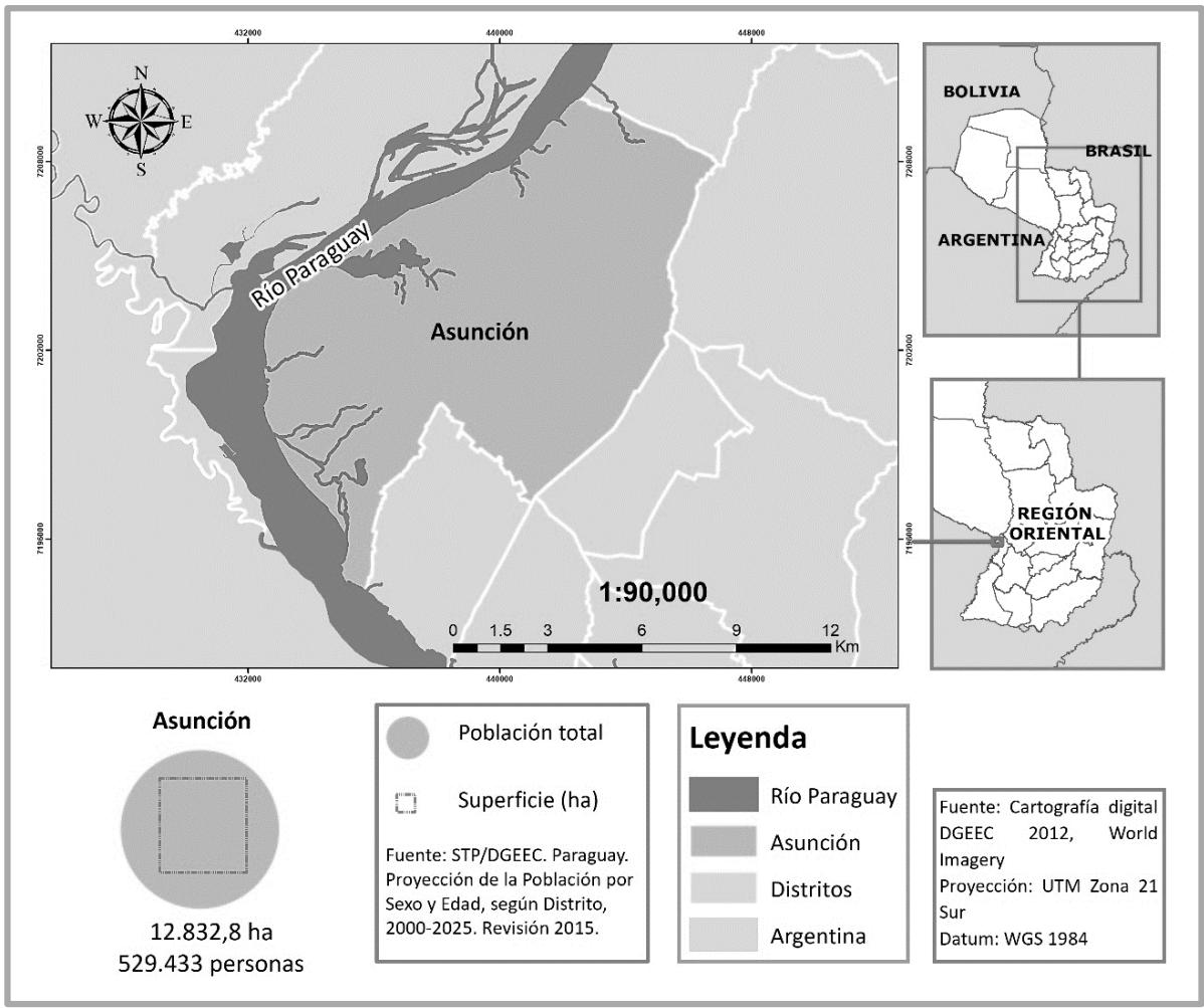 15' y $25 ^ { \circ } 20 ^ { \prime }$ de latitud sur y entre los meridianos $57 ^ { \mathrm { { o } } }$ 40' y $57 ^ { \mathrm { { o } } }$ 30' de longitud oeste, es la ciudad más poblada del país. Está situada sobre la orilla izquierda del río Paraguay, que la separa al noroeste de la región Occidental y al sur del territorio argentino, frente a la confluencia de los ríos Pilcomayo y Paraguay; rodeada por el departamento Central, con el que limita al norte, este y sur (25) (Figura 1).
