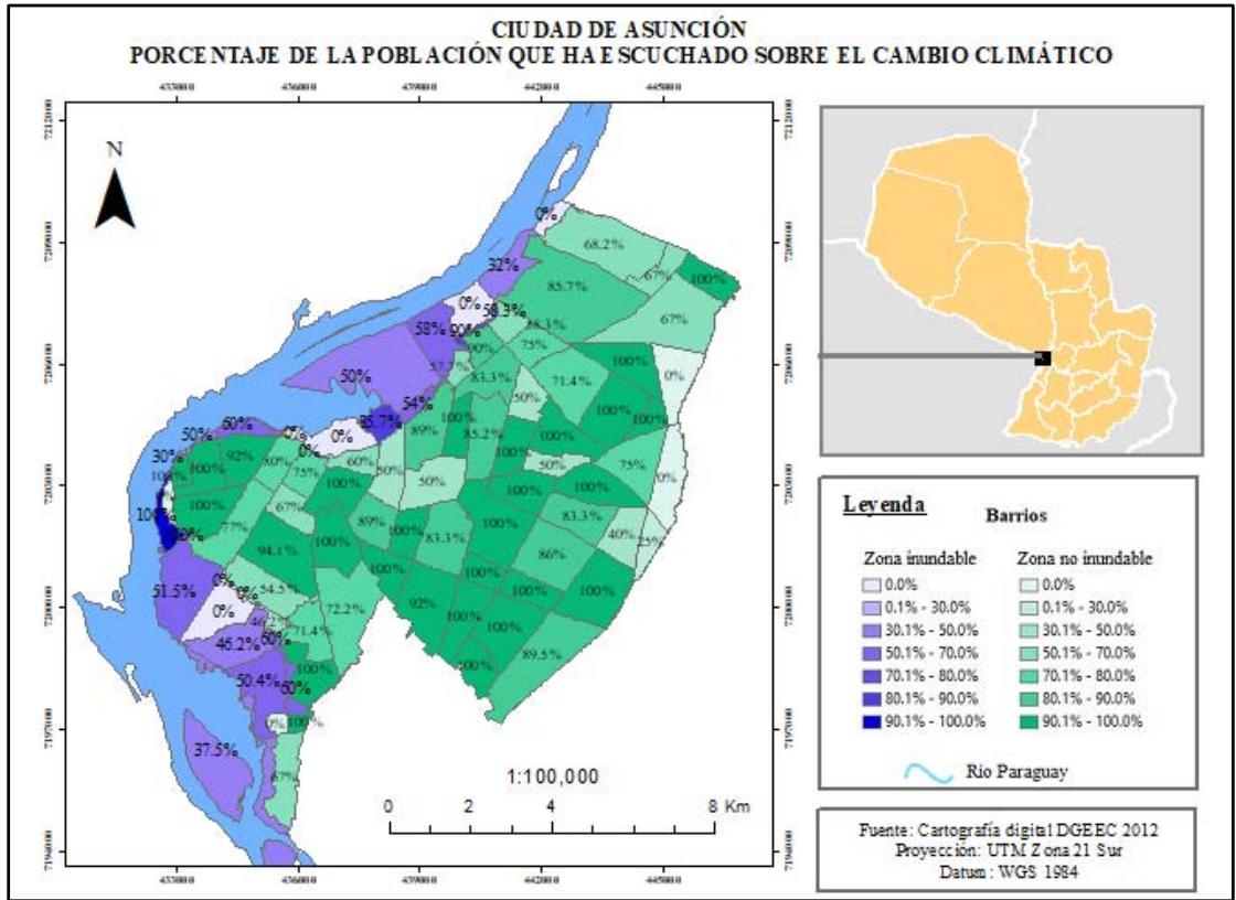 Los resultados obtenidos en la presente investigación señalan que tres de cada diez asuncenos no han escuchado sobre el cambio climático o que el clima está cambiando con respecto al pasado, revelando una menor proporción con respecto a otras investigaciones. Considerando las subpoblaciones, existe un mayor desconocimiento en la zona inundable. Probablemente las difusiones o comunicaciones sobre cambio climático siguen siendo de escasa cobertura a nivel nacional, principalmente en las zonas más afectadas.