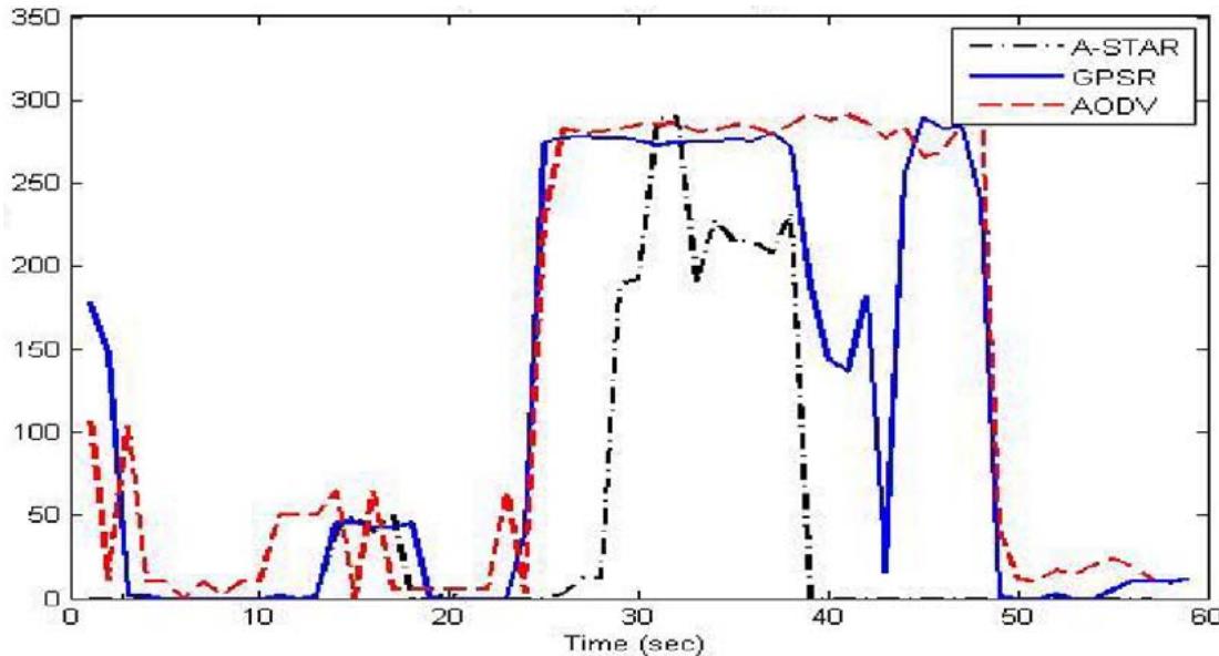 The normal number of dropped packets by AODV, GPSR and A-STAR routing protocols within the sight of deterrents. Figure 5 shows unsteadiness in the exhibition of every one of the three routing protocols as far as packet drop. AODV packet drop rate was high than GPSR and A-STAR. While AODV showed unforeseen outcomes in the enormous city conditions by dropping less number of packets for the initial 25 seconds. As distance between the nodes with in the city environments are less and also the vehicles moved with low speed that is why AODV successful to deliver some packets to the destination as it received RREP from the closed nodes immediately. But this low drop packet rate only for the short time interval after some time AODV had highest number of dropped packets, it may due to the communication obstacles between the nodes.