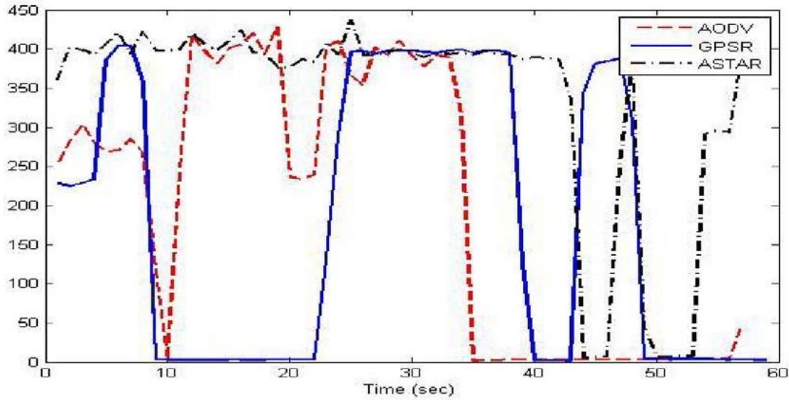 On the whole it can be concluded that A-STAR has better performance in terms of throughput as compared to GPSR and AODV where there is number of obstacles interrupt the communication. Furthermore, GPSR outperformed AODV in terms of throughput.