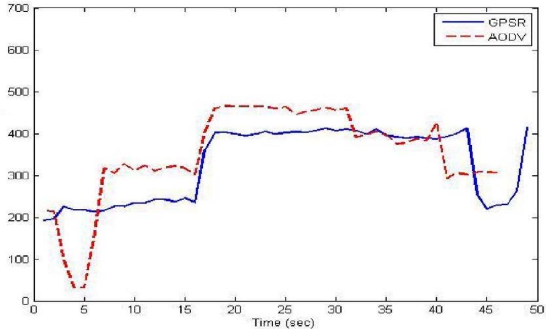On the other hand GPSR shows the average throughput results in the city scenario. There were also some dramatically changes in the performance of GPSR shown in Figure 4. Although GPSR is a position based routing protocol but its performance was average and at some level throughput rate reduced to zero.
