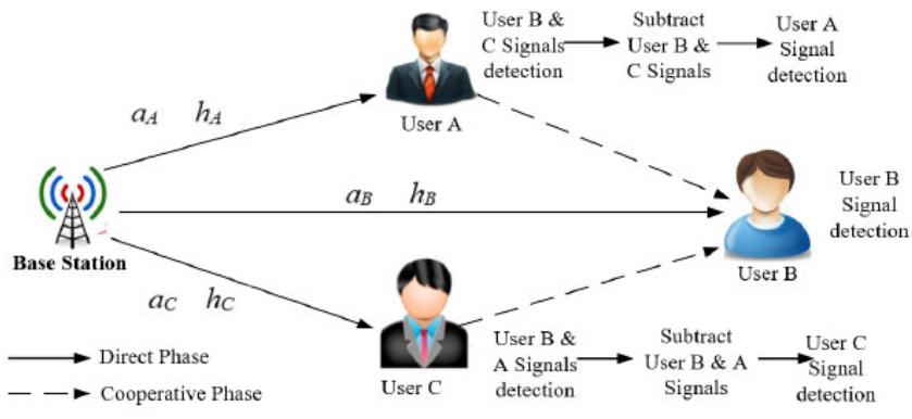 Cooperative NOMA is another important concept that, when combined with NOMA, improves the system performance for users in downlink transmission, and further improves system efficiency in terms of capacity and reliability [13]. In downlink transmission, channel conditions may vary due to the near-far problem and self-interference. The users in various channel conditions can be categorized as strong or weak. In C-NOMA, the strong users can serve as relays for the weak users, which has the potential to utilize the spatial degree of freedom (DoF) even for users with a single antenna [29]. Furthermore, users in strong channel conditions employ SIC at the receiver in NOMA by decoding messages of users who belong to weak channel conditions is the main advantage in C-NOMA [14]. We will consider a four-node system network, i.e., BS, Users A, B, and C, as shown in Fig. 2 [30]. The BS transmits the message for user A, which is superimposed with symbols of both A and C. Therefore, user A should subtract the messages of users B and C before decoding its message using SIC. Similarly, user C decodes its message C. In this approach, users A and C are considered as relays and forward their messages. As a result, three copies of messages are received via different channels (two copies through the cooperative phase and one from the direct phase).