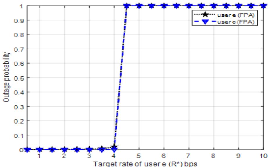 Through simulation, we assess the effectiveness of the suggested resource allocation strategies in this section. Fig. 4 shows the outage probability achieved by the scheme and is shown as a function of the minimum data rate for the cell edge user when fixed power allocation (FPA) is used and $\alpha_{\mathrm{e}} = 0.95, \alpha_{\mathrm{c}} = 0.05$. The distances from the BS to the users are set at $d_{\mathrm{e}} = 500\mathrm{m}$, $d_{\mathrm{c}} = 100\mathrm{m}$ for Figs. 4 and 5 and the path loss exponent $\epsilon = 4$. It can be seen from Fig. 4 that FPA is performing very poorly, despite having user c close to the BS, and the probability of the system failing is relatively high all the time when the target rate is more significant than 4.5 bps. This is because FPA does not take into consideration the channel state information