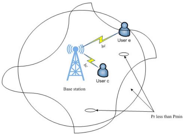 Fig. 1. is an example of a two-user downlink NOMA system in the power domain with SIC being implemented at user 1 (user c) and superposition coding at the transmission side where the transmitter transmits multiple users signals at the same time [11], in this case, signals of user c and user e. The transmitted signal is given by: