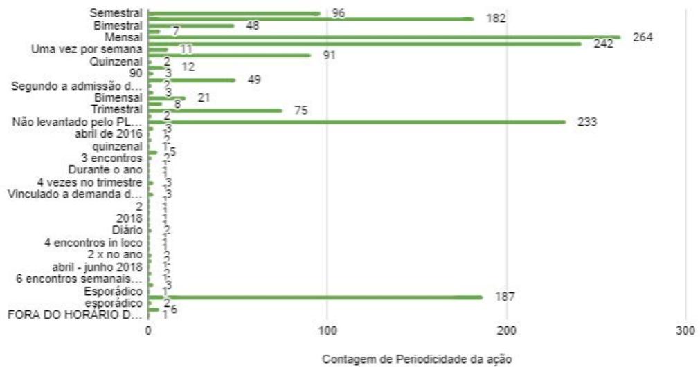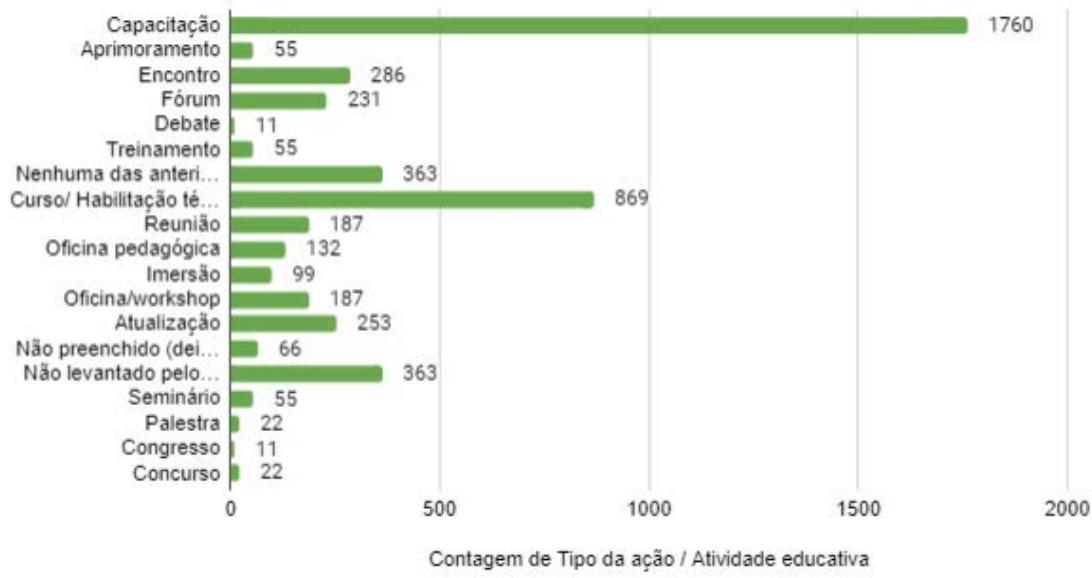 Regarding the type of educational action, we noticed a strong prevalence of Training (1760) and Technical Courses/Habilitation (869). Other categories that presented most answers were: Gathering (286) and Updating (253). The frequency with the highest number of answers was Monthly (264), followed by once a week (242); Sporadic (187) and Bimestral (182).