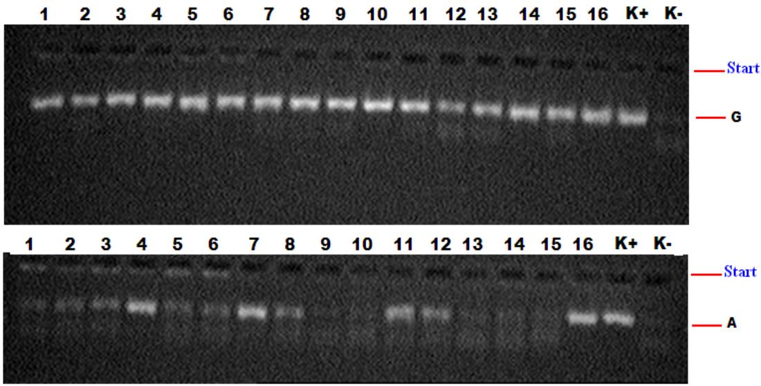 <table><tr><td>Alleles and genotypes</td><td>Main group</td><td>Control group</td><td>x2</td><td>P</td><td>OR</td><td>95% CI</td></tr><tr><td>G</td><td>262</td><td>279</td><td rowspan="2">6.1</td><td rowspan="2">0.01</td><td rowspan="2">1.7</td><td rowspan="2">1.109-2.556</td></tr><tr><td>A</td><td>68</td><td>43</td></tr><tr><td>G/G</td><td>99</td><td>118</td><td>6.5</td><td>0.01</td><td>0.5</td><td>0.3424- 0.8727</td></tr><tr><td>G/A</td><td>64</td><td>43</td><td>5.4</td><td>0.02</td><td>1.7</td><td>1.08- 2.77</td></tr><tr><td>A/A</td><td>2</td><td>0</td><td>2.0</td><td>0.2</td><td>-</td><td>-</td></tr></table>
