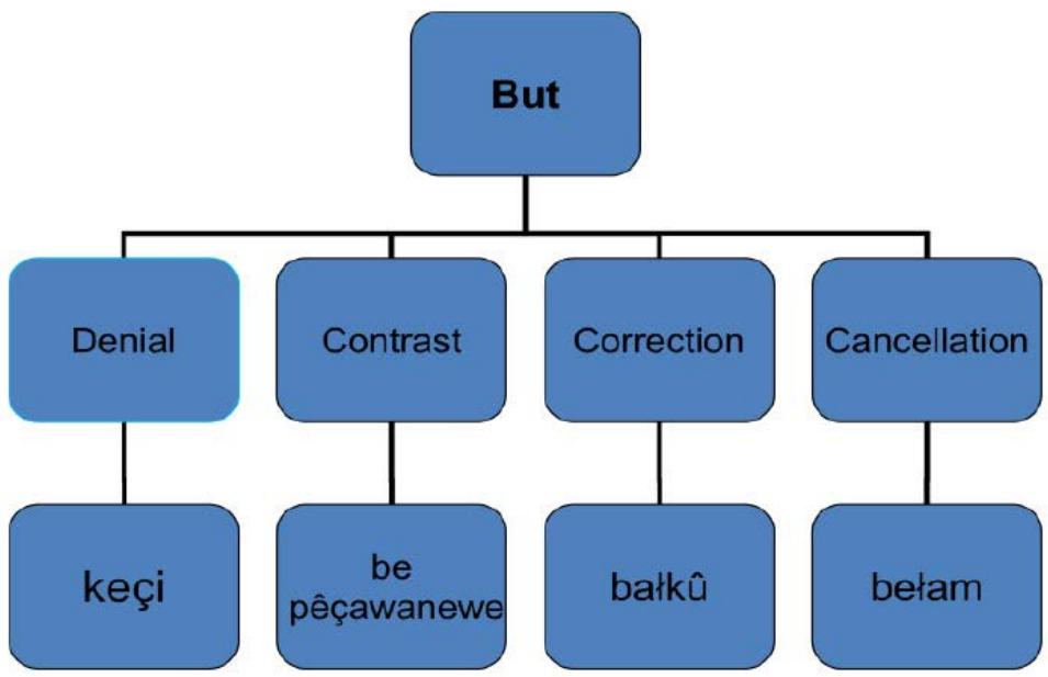The claims about the 'ambiguity' of the English connective but are not entirely true (Anscombe and Ducrot, 1977: 26). Based on a relevance-theoretic approach and according to the different translation options, this paper concludes that but is a polysemous connective and that it has four distinct, yet interrelated, procedural meanings. These meanings shall cause minimal ambiguity when translating from English into Kurdish, because each of the four distinct meanings fits into a specific interpretation of the general procedure. However, having no detailed research about Kurdish connectives would pose a challenge to translators, as they need to be aware of the textual functions of each connective and the contexts in which they are used in order to have a flawless final product in their translation. Based on the Relevance Theory's procedural account, there are four distinct interpretations of the general procedure associated with but, namely; denial, contrast, correction and cancellation, which are translated into Kurdish as keci, be peçewanewe, belkû and belam respectively as shown in Figure 2.