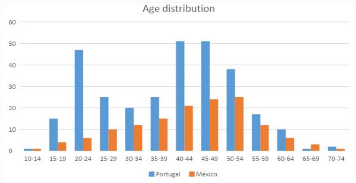 The sample used in this research study comprises 444 participants, 303 of whom are from the district of Guarda, Portugal, and 141 from the state of Chiapas, Mexico, corresponding to $60.81\%$ (270) female respondents. Regarding the distribution of ages, the groups that have provided the most responses are the groups between the age range of 45-49 years old, followed by those between 40-44 years old, and, subsequently, ages between 50 and 54 years old and 20-24 years. These groups represent $59.37\%$ of the sample (See Figure 1).