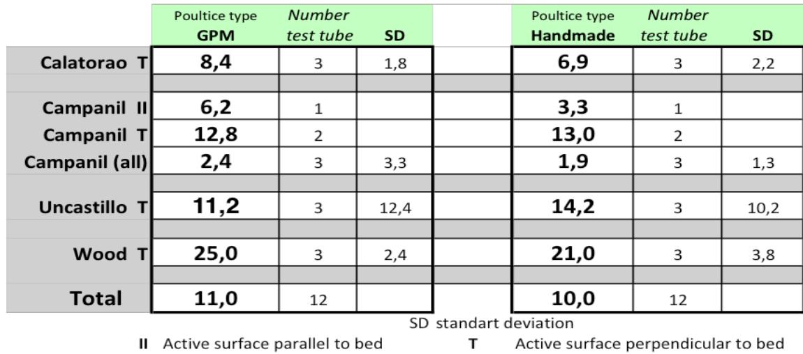 The data about Campanil and Uncastillo stone's was not very significant because the standard deviations were of the same order as the value of the data. The values indicated that the penetration was greater in "GPM" samples in the case of the limestone from Calatorao, the Campanil limestone and the pine wood, while in the case of the sandstone from Uncastillo it was higher in "handmade" test tubes. In the case of the Campanil limestone, a marked absorption anisotropy was seen in the direction perpendicular to that of the stratification, especially in "GPM" poultices.