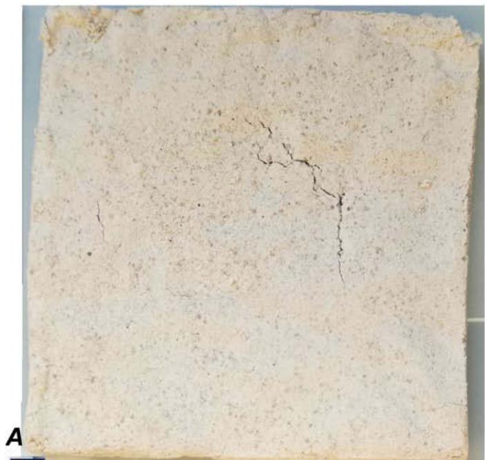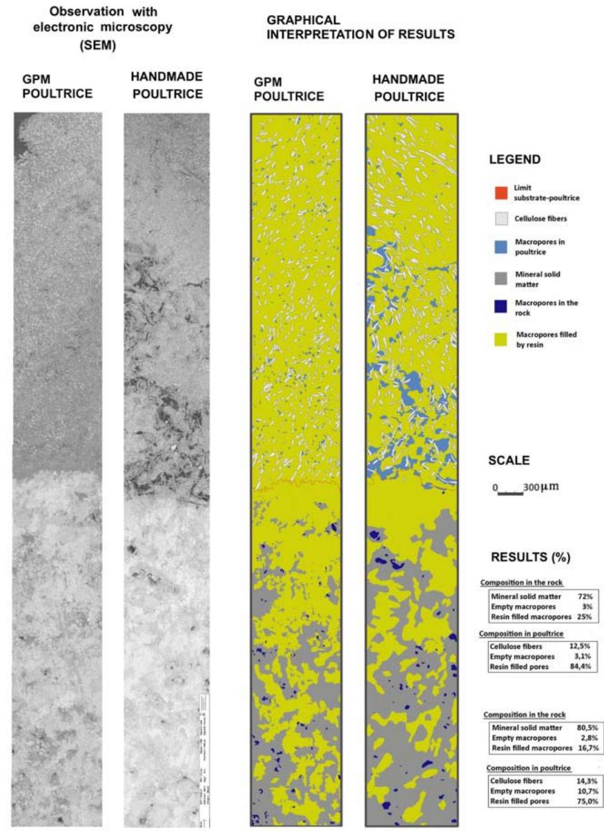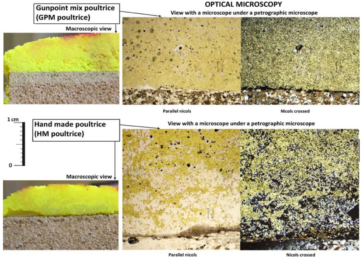 Macroscopically (fig 2A), it could be seen that the "handmade" had lost volume during drying, which resulted in loss of thickness and detachment of the substrate. The "GPM" maintained volume and adhesion. At this scale it is also possible to observe that the epoxy resin had penetrated about 1.5 mm under the "handmade" poultice and 3 mm under the "GPM" poultice.