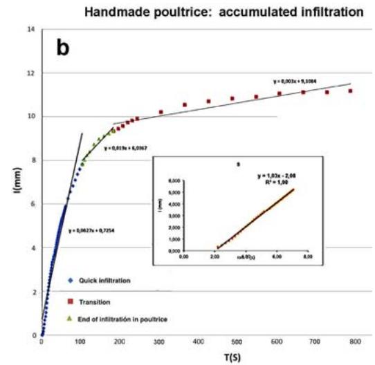 We assume that the curve represents the infiltration on the poultice, given the effect of the rock is considered negligible (it has a very low quantitative value, see coefficients of suction in Table 4b). In figures 4a and 4b we can observe the behavior of the two types of poultices.