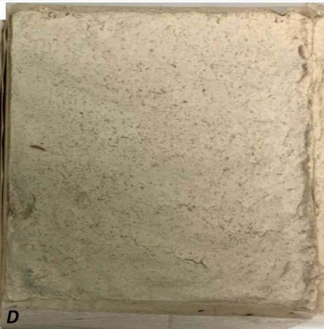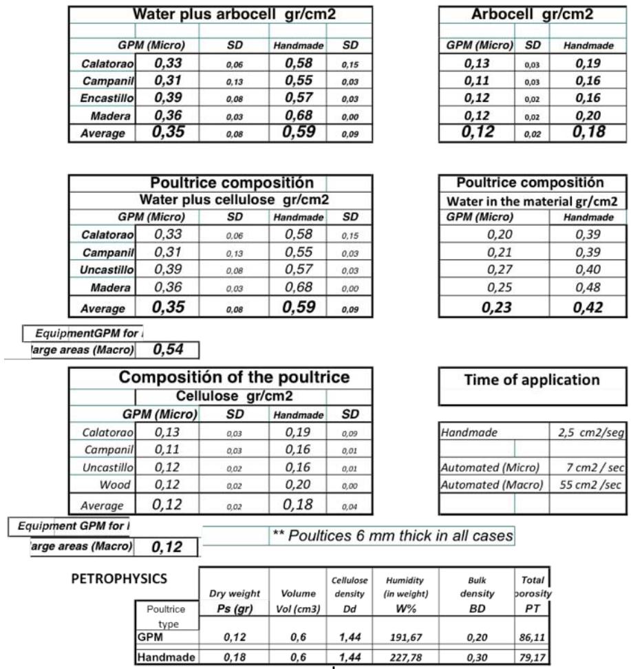 Methodology: In both cases we used the same cellulose pulp mixed with demineralized water. In the case of handmade poultices, 38.4 grams of dry cellulose were mixed with $100\mathrm{ml}$ of water. Inthe case of GPM poultices the proportion was $52\mathrm{gr}$ of dry cellulose with $100\mathrm{ml}$ of demineralized water.