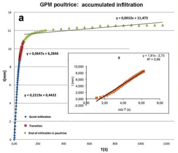 In the curve of the "GPM" poultice (fig 4a) infiltration begins very fast (0.22 ml/s, stretch in blue); as the test tube soaks, the rhythm decreases (0.03 ml/s; stretch in red), and when apparently, the entire poultice is soaked, infiltration almost stops (0.001 ml/s, stretch in green). This stopping was not complete, although this did not imply that water infiltrated into the stone from Calatorao, as water percolated through the contact surface and the sides. The behavior was very homogeneous within each stretch.