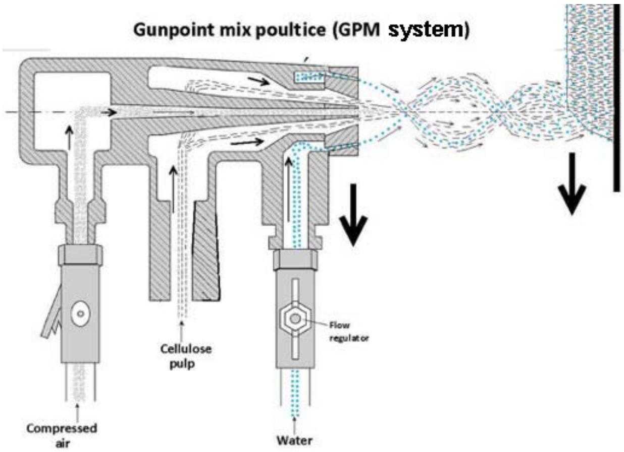 Gun Point Mix poultice (GPM), produced automatically with compressed air, has an apparent density of $0.2\mathrm{g/cm^3}$, an application speed between 420 and $3300\mathrm{cm^2/s}$ (depending on the projection equipment) and a great homogeneity and adhesiveness (it allows to generate poultices in upside-down vaults), without this last property being translated into greater soiling. The porosity is homogeneous, of the order of $86\%$, mostly $(82.9\%)$ with a size of the same order as the fiber used $(10x200\mu\mathrm{m})$ and to a lesser extent $(3.1\%)$ with larger pores $(30-50\mu\mathrm{m})$. Its hydraulic conductivity is $1\mathrm{l/m^2 s^{-2}}$. The system allows to regulate the amount of water at operator's will and needs a gun and compressed air equipment specially designed for the projection.
