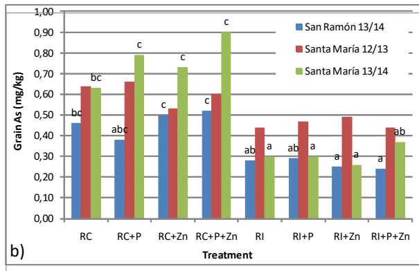 Phosphate added to the soil can compete with arseniate (AsV) and arsenite (AsIII) for the soil adsorption sites, decreasing the amount of As adsorbed, giving as a result, a greater availability of As. For this reason, in flooded soils environments where AsIII is the dominant species, the application of phosphate could increase As toxicity. However, in both experiments, the plots that received an addition of P did not show an increase of As in grain.