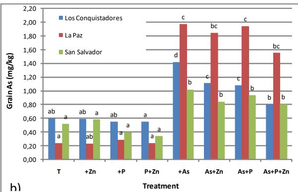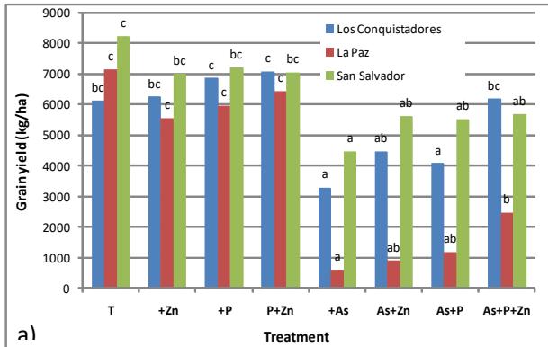 The effect of treatments and site was very significant on most variables evaluated. There was a considerable interaction between the treatments and the sites on yield and As concentration in grain (Figure 2).