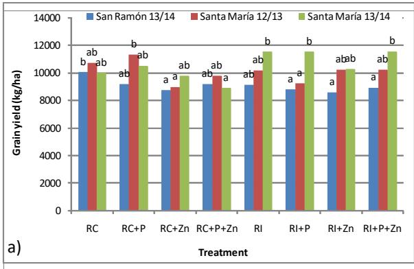 During the 2012/13 and 2013/14 seasons, in the localities of Santa María and San Ramon, province of Entre Ríos, Argentina, three field studies was conducted in a split-plot design within the farm field, with three replications. Soils in the sites studied are classified as Vertisols. The main plot was divided by water management in: i) continuous flood irrigation (RC) from the state of 4-leaf crop to maturity, and; ii) continuous flood irrigation interrupted (RI) during the growing season (paddy soil was drained 15 days before panicle differentiation, and was again flooded until maturity). Each subplot was subdivided with the following fertilization treatments at the moment of planting: a) control, without of P and Zn (T); b) fertilization with 200 kg ha $^{-1}$ of calcium triple superphosphate (20% P), equivalent to 40 kg P ha $^{-1}$ (+ P); c) fertilization with Zn, at a rate of 25 kg ha $^{-1}$ ZnSO $_{4}$.7H $_{2}$ O (22% Zn) (+ Zn) and d) fertilization with P and Zn, combining the treatments (+ P) and (+ Zn) (+ P + Zn).