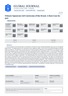 Maria Clara Vieira Martinez, Isabella Franco Barbosa Pesce, Pietra Lopes Monti, Letícia Dalavale Fabretti, Roseane Rigo, Daniela Videira Botton, Thais Luiza Pavan Martins, Vitória Ribeiro Farinha, Carla de Freitas, Flávia Vicentin Silva, Luciana Borges Lombardi. 2026. \u201cPrimary Squamous Cell Carcinoma of the Breast: A Rare Case Report\u201d. Global Journal of Medical Research, Global Journal of Medical Research - F: Diseases GJMR-F Volume 26 (GJMR Volume 26 Issue F1): .