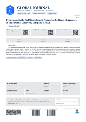 Mbo Muzir Jeean Baptist, Kitoko Tamufi Etienne. 2026. \u201cProblems with the Staff Recruitment Process by the Heads of Agencies of the National Electricity Company (SNEL)\u201d. Global Journal of Management and Business Research, Global Journal of Management and Business Research - A: Administration & Management GJMBR-A Volume 26 (GJMBR Volume 26 Issue A1).