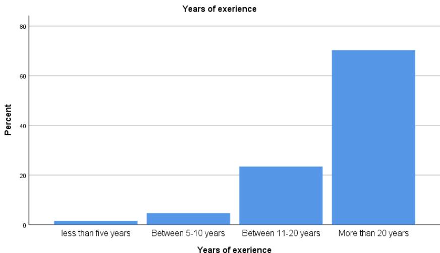 The graph demonstrates the percentage of participants in terms of years of experience. As shown, under $10\%$ of participants have less than five years of experience, under $20\%$ have 5-10 years of experience, under $40\%$ have 11-20 years of experience, and more than $60\%$ of the participants have more than 20 years of experience.