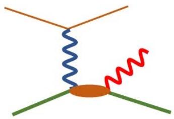 Figure 3: One of the Feynman diagrams includes virtual Compton scattering. The orange line is an electron, the green one is a proton, the blue one is a virtual photon. The red one is a real one. R. Li et al. / Nature, 2022