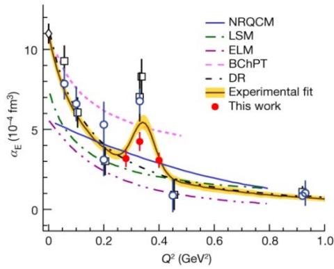 Figure 4: Dependence of the electric polarizability on the square of the transmitted 4-momentum. The red dots indicate the experimental results obtained by fitting the model (black line with a yellow stripe). Circles and squares indicate the results of previous experiments. R. Li et al. // Nature, 2022