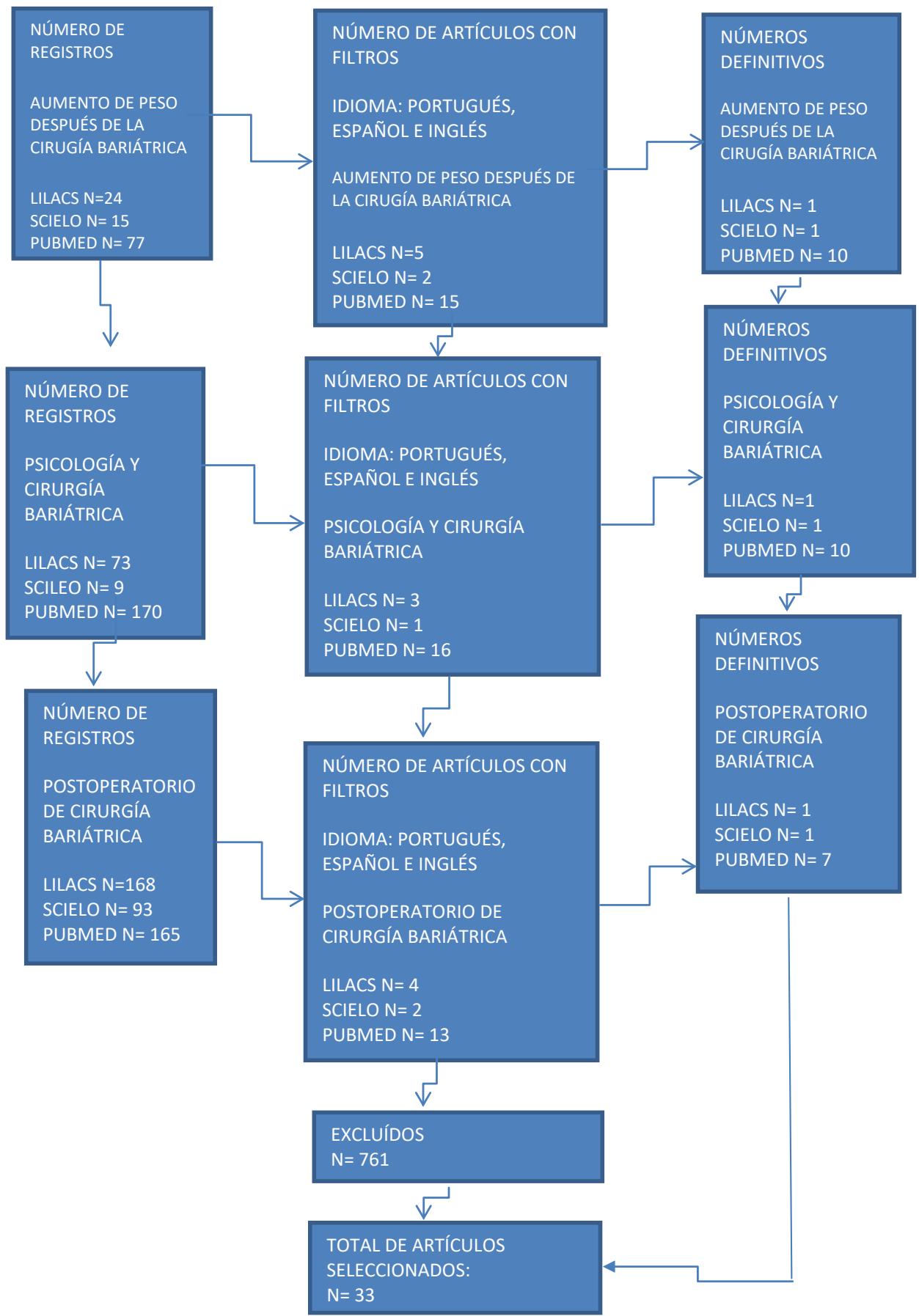 Para llevar a cabo esta revisión literaria se realizó una búsqueda bibliográfica en las bases de datos por la metodologia PRiSMA: Literatura Científica y Técnica de América Latina y el Caribe (LILACS), Sistema en Línea de Búsqueda y Análisis de Literatura Médica (PUBMED/MEDLINE) y en la base electrónica Scientific Eletronic Library Online (SCIELO), usando los descriptores: "Postoperatorio de cirugía bariátrica" (Post Bariatric Surgery), "Psicología y cirugía bariátrica" (Psicology and Bariatric Surgery) y "Aumento de peso después de la cirugía bariátrica" (Weight Regain After Bariatric Surgery), asociados al operador booleano AND. Todos los datos fueron recopilados, tabulados y analizados en enero de 2022 (Urrútia, 2010). Considerando los criterios de inclusión de artículos, inicialmente fueron seleccionados 794 originales disponibles en portugués, inglés y español, comprendidos entre enero de 2017 y enero de 2022 (figura 1). Estos artículos fueron seleccionados porque analizaban la relación entre aspectos del aumento de peso y sus relaciones con las psicopatologías y la adherencia o no al equipo multidisciplinario. Los artículos incluidos pueden ser ensayos clínicos, estudios de cohortes, cohortes históricas o estudios de casos y controles. Los artículos como Narrativa, Editorial, Carta al Editor, Comunicación preliminar o reporte de casos fueron excluidos. De cada artículo se extrajo la siguiente información: autor, año de publicación, número de pacientes, tiempo de seguimiento, casos de estudio, metodología aplicada y resultados. Los resultados de los estudios fueron analizados descriptivamente.