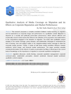 Md. Nafis Shakil. 2026. \u201cQualitative Analysis of Media Coverage on Migration and Its Effects on Corporate Reputation and Market Performance\u201d. Global Journal of Management and Business Research, Global Journal of Management and Business Research - B: Economic & Commerce GJMBR-B Volume 26 (GJMBR Volume 26 Issue B1): .