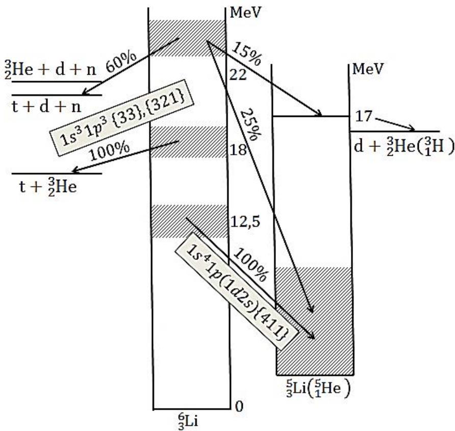 Figure 2: The scheme for excitation and decay of $^6\mathrm{Li}$ as a result of the absorption of $\gamma$ -quanta, predicted by the theory in diagonal approximation [4].